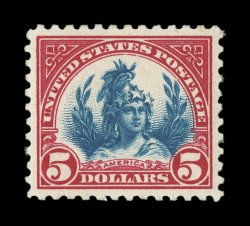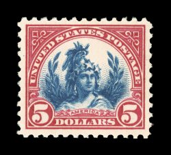 905 nhu 573 image#573, $5.00 Carmine and blue, top sheet-margin plate no. F14327 single, deep rich colors and razor-sharp impressions on fresh white paper, exceptionally well centered and margined, o.g., n.h., extremely fine; 2006 PSE certificate VF-XF 85; SMQ $285.00). (Image) $240.00