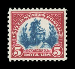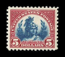 901 ogu 573 image#573, $5.00 Carmine and blue, extraordinarily well centered, brilliantly rich colors, o.g., l.h., extremely fine; encapsulated PSE certificate (XF-Superb 95; SMQ $230.00). (Image) $110.00
