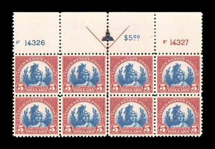 906 nhPB 573 image#573, $5.00 Carmine and blue, handsome full top margin arrow and plate nos. F14326, F14327 block of eight, especially well centered for a plate block, beautiful vibrant colors, o.g., n.h., some minor typical flat plate gum bends, the staple holes at top have been neatly filled in, extremely fine; clear 2003 APS certificate. (Image) $3,500.00