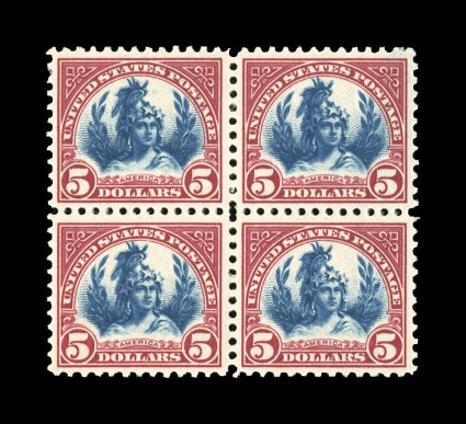908 nhbl 573a image#573a, $5.00 Carmine lake and dark blue, choice quality mint block of four, exceptionally well centered, wonderfully bright and fresh with deep colors, pristine o.g., n.h., extremely fine; 2006 PSE certificate. (Image) $1,500.00