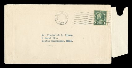 909 c 575 var image#575 var., 1c Green imperforate, with Schermack Ty. III perforations, handsome single neatly tied to printed matter cover to Boston Highlands, Mass. by "Grand Central Sta., N.Y./1924" machine cancel without date and month, light edge wrinkles to cover, very fine; this is precisely the way this 1c vending coil was intended to be used and why it is so scarce, very few printed matter covers were saved, and everything about the this cover substantiates its printed matter status including the cancel, the rate and the patent envelope, which has a tab at right to be pulled out for postal inspection, an exceptional and rare cover for exhibition. (Image) $400.00