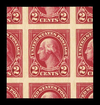 910 nhu 577 image#577, 2c Carmine imperforate, striking mint single that was cut from a multiple so that large equal portions of the adjoining eight stamps are showing, deep intense color, o.g., n.h., a superb gem; 2005 PSE certificate (Gem 100 Jumbo); the highest grade possible for any stamp. (Image) $2.90