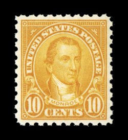 916 nhu 591 image#591, 10c Orange, a magnificent premium quality mint single, being perfectly centered within large margins that are not at all typical to this stamp, eye-arresting brilliant color and a vivid impression, unblemished o.g., n.h., extremely fine; a gorgeous gem for the most discriminating collector; 1988 PF certificate and 2006 PSE certificate (Superb 98; SMQ $1,500.00); the highest grade given to any #591 by the PSE, being one of only four never hinged examples to achieve this lofty grade. (Image) $125.00