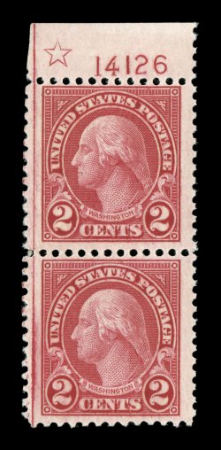 919 og 595 image#595, 2c Carmine coil waste, impressive top sheet-margin star and plate no. 14126 vertical pair, most unusual are the absolutely immense margins at sides, being beautifully positioned between them, quite well centered top to bottom for this issue as well, radiant color, o.g.,very lightly hinged, very fine. (Image) $550.00+