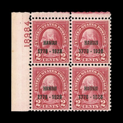 963 nhPB 647 image#647, 2c Hawaii Sesquicentennial, top left plate no. 18984 block of four, uncommonly well centered, deep color and impression, o.g., n.h., choice very fine. (Image) $250.00