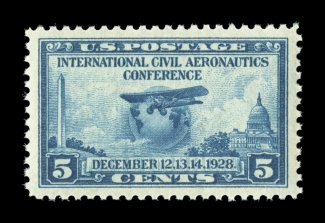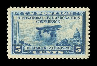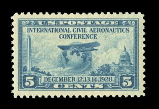 965 nhu 650 image#650, 5c Aeronautic Conference, gorgeous mint single, precisely centered within very large margins, rich luxuriant color and a razor-sharp impression on fresh white paper, unblemished o.g., n.h., extremely fine; 2007 PSE certificate (Superb 98; SMQ $350.00). (Image) $7.25