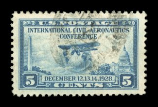 967 Ou 650 image#650, 5c Aeronautic Conference, an eye-arresting used example that is extraordinarily well centered within lavishly large margins, strong rich color, lightly cancelled, extremely fine; 2003 PSE certificate (XF-Superb 95 Jumbo; SMQ $100.00 for 95 and $280.00 for 98). (Image) $3.25