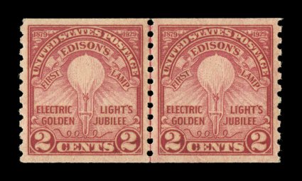 970 nhu 656 image#656, 2c Electric Light Jubilee, a "perfect" joint line pair, mathematically precise centering within uncommonly large margins, deep intense color and impression, flawless o.g., n.h., a superb gem and truly rare in this magnificent quality; 2001 PF certificate and a 2007 PSE certificate (Gem 100; SMQ not priced in this grade, $960.00 for a 98); this is the sole line pair of #656 to be awarded this coveted grade, the highest to date. (Image) $110.00