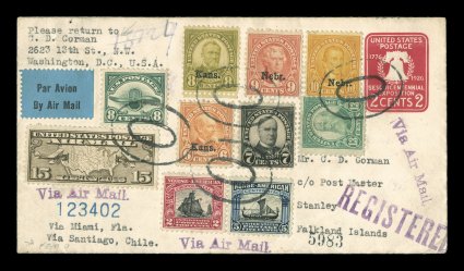 971 c 620/679, C4/8, U522 image#620/679, C4/8, U522, 2c Sesquicentennial envelope heavily franked with ten adhesives including five Kans.-Nebr. overprints with the 8c Kans. and 10c Nebr., posted from Washington, D.C. to Port Stanley, Falkland Islands, flown by air from Washington to Santiago, Chile via Atlanta and the Canal Zone including the 1929 first flight on FAM 9 from the Canal Zone to Santiago, backstamped Port Stanley on August 24, 1929, then evidently returned with London October 1st transit, light bend affecting the #C8, very fine; an unusual and well travelled cover of about 20,000 miles. (Image) Est. 200-300
