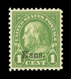 972 nhu 658 image#658, 1c "Kans." ovpt., a fabulous quality mint example of this relatively common value, being flawlessly centered within much larger margins than usually found, plus its color is particularly rich and bright, highly detailed impression as well, o.g., n.h., superb; 2007 PSE certificate (Superb 98; SMQ $410.00); the highest grade awarded to this stamp by the PSE, being one of only two to be so graded. (Image) $4.00