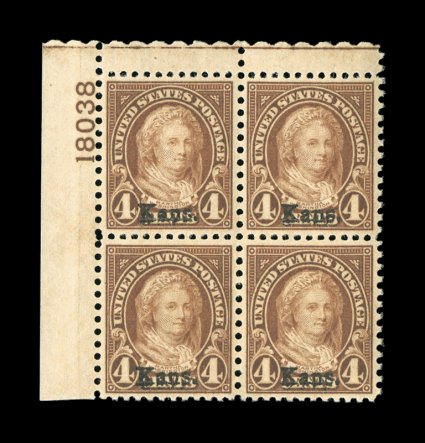 974 ogPB 662 image#662, 4c "Kans." ovpt., top left corner margin plate no. 18038 block of four, uncharacteristically well centered throughout, rich luxuriant color, o.g., faintest trace of hinging (if at all) on top pair, extremely fine; 2005 PF certificate; ex-Fogelson. (Image) $200.00