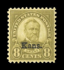 975 nhu 666 image#666, 8c "Kans." ovpt., remarkably well centered and margined, deep rich color and an especially intense impression, pristine o.g., n.h., an extremely fine gem; 2005 PF certificate and a 2007 PSE certificate (XF-Superb 95; SMQ $1,000.00). (Image) $180.00