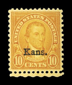 976 nhu 668 image#668, 10c "Kans." ovpt., a highly desirable mint bottom sheet-margin single that is marvelously well centered, deep intesne color and impression, o.g., n.h., extremely fine; 2006 PSE certificate (XF-Superb 95; SMQ $485.00). (Image) $45.00