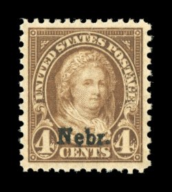 978 nhu 673 image#673, 4c "Nebr." ovpt., excellent centering within uncharacteristically large margins, sumptuously rich color and a crisp impression, o.g., n.h., extremely fine; 2006 PSE certificate (XF-Superb 95; SMQ $430.00). (Image) $35.00