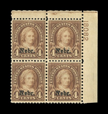979 nhPB 673 image#673, 4c "Nebr." ovpt., top right corner plate no. 18082 block of four, deep intense color, unusually well centered, o.g., n.h., very fine. (Image) $360.00