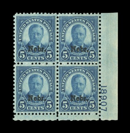 980 nhPB 674 image#674, 5c "Nebr." ovpt., attractive bottom right corner margin plate no. 18907 block of four, exceptionally well centered, deep color, o.g., n.h., extremely fine. (Image) $400.00