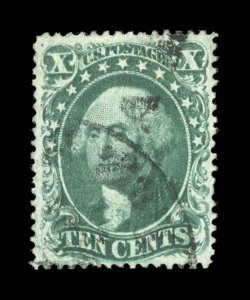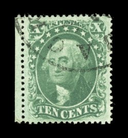82 Ou 33 image#33, 10c Green, Ty. III, a striking used left sheet-margin single, possessing lavishly large margins all around and being extraordinarily well centered within these impressive borders, lovely rich color, neat town c.d.s., extremely fine; a gorgeous large-margined gem; 2000 PF certificate and a 2005 PSE certificate (XF-Superb 95 Jumbo; SMQ $1,600.00 for 95 and $3,550.00 for 98); this is the only example in the PSE population report to be given this grade, the highest achieved to date. (Image) $300.00