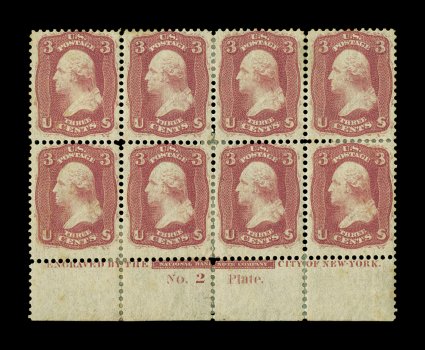 95 ogPB 56 image#56, 3c Brown rose "August", full bottom margin imprint and plate "No. 2" block of eight, lovely fresh rich color and a detailed impression, quite well centered for this typically poorly centered issue, full o.g. with some sensible hinge reinforcement of separated perforations, tiny thin speck in bottom right stamp which is truly minute, plus a few equally trivial toned flecks, otherwise nearly very fine for this remarkably rare plate block of which only six such plate blocks are recorded in the Chapin census (all of which are bottom positions); 1972 PF certificate. (Image) $20,000.00