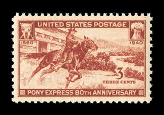 1065 nhu 894 image#894, 3c Pony Express, a "perfect" mint example that is flawlessly centered within large balanced margins, strong rich color, o.g., n.h., superb; 2006 PSE certificate (Gem 100; not listed in SMQ); this is the sole example of this stamp to be graded Gem 100, the highest given to date. (Image) $0.40