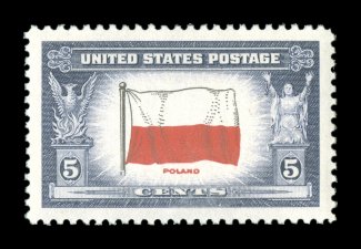 1067 nhu 909c image#909c, 5c Poland, reverse printing, perfectly centered within extraordinarily large margins, deep intense colors, o.g., n.h., superb; 2006 PSE certificate (Gem 100; SMQ $180.00); the Scott and SMQ values are for the normal #909, as they are not priced as the variety. (Image) $0.20