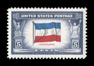1069 nhu 917 image#917, 5c Yugoslavia, mathematically precise centering within lavish margins, marvelously bright and fresh, o.g., n.h., superb; 2006 PSE certificate (Gem 100; SMQ $240.00): the highest grade assigned to this stamp. (Image) $0.25