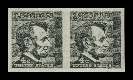 1072 og 1303b image#1303b, 4c Black Lincoln coil, imperforate, rare pair of this popular Lincoln topical error, large perfectly symmetrical margins all around, o.g., lightly hinged, extremely fine; only 100 imperforate pairs of this have been reported. (Image) $750.00
