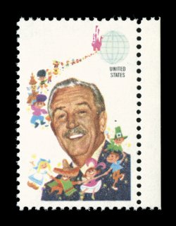 1073 nh 1355a image#1355a, 6c Walt Disney, ocher omitted, choice right sheet-margin mint single of this scarce and popular color error that is missing both the "Walt Disney" inscription and the denomination, o.g., n.h., extremely fine. (Image) $500.00