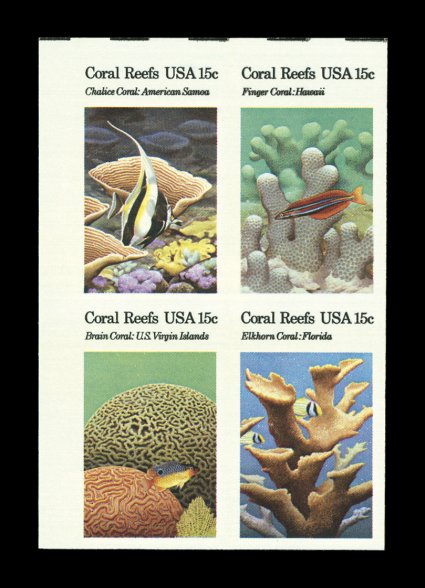 1077 nhbl 1830b image#1830b, 15c Coral Reefs se-tenant block of four, imperforate, top left corner margin block of four, o.g., n.h., extremely fine and a very attractive error block. (Image) $500.00