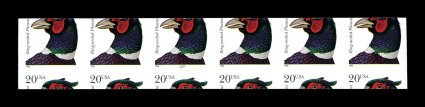 1078 nh 3055a image#3055a, 20c Ring-necked Pheasant self -adhesive coil, serpentine die cut omitted (imperforate), plate no. 2222 strip of six, in addition this strip shows a drastic miscutting of the coil just below th eye of the Pheasant, full n.h. backing, fresh and striking error; Datz notes that a total of only 70 pairs are recorded consisting of 50 pairs of this miscut imperforate and 20 pairs of the normal imperforate, thus a total of only three or four plate number strips are possible; Datz lists but does not price plate no. 1111, but does not list plate 2222. (Image) Est. 500-750