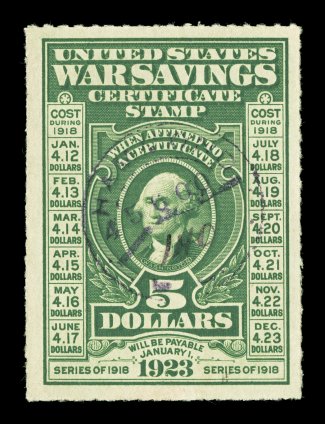 1301 O WS3 image#WS3, $5.00 Deep green, rouletted 7, an incredibly choice used example, not only is this stamp extraordinarily well centered and with strong rich color, but it is also noteworthy for possessing a handstamp and light ms. cancel, which is unlike the vast majority of "used" examples, with are simply no gum copies that were removed from savings booklets (and to which the used value in Scott applies), extremely fine; a truly gem used War Savings Stamp; 2005 PF certificate for a pair, this being the bottom stamp. (Image) $650.00