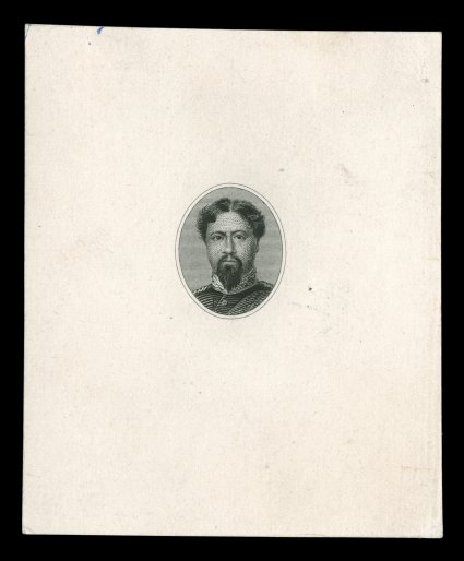 1305 E 32E image#32E, (5c) Black, vignette die essay on India, the head of Kamehameha V (M-H 34.8402), on original card being about the size of the die sinkage which measures 60x74, a seldom seen essay, fresh paper and color, very fine. (Image) Est. 400-500