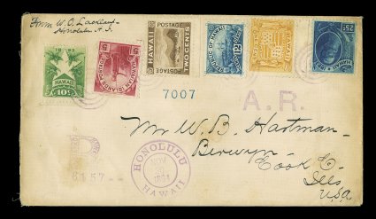 1307 c 74-79 image#74-79, 1c-25c Pictorials cplt., tied to registered cover to Berwyn, Ill. by purple target cancels, with matching November 30, 1894 Honolulu c.d.s., "A.R." and fancy "R" registry handstamps, San Francisco backstamp, edge soiling slightly affecting two stamps, fine and scarce as a set cover. (Image) Est. 300-400