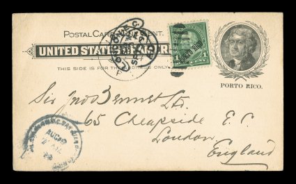 1310 c 210, UX1 image#210, UX1, 1899 1c Black on buff postal card with additional 1c Green overprint tied by grid cancel, posted to London, England with San Juan military station no. 4 pmk. of August 19, 1899 at bottom left, London receiving cancels on the front, minor corner creases to the card, very fine and scarce used in the proper time period. (Image) Est. 200-300