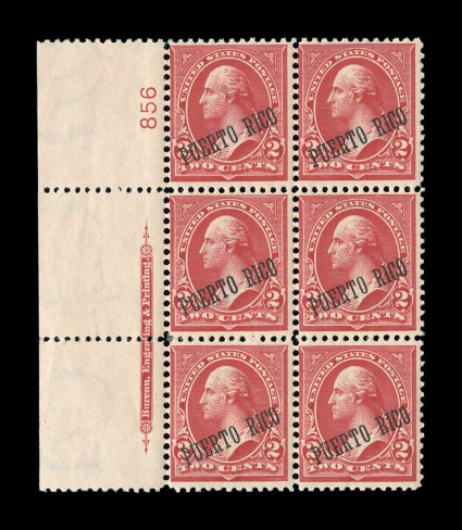 1311 ogPB 211a image#211a, 2c Reddish Carmine, 25 degree overprint, fresh left sheet margin imprint and plate no. 856 block of six, rich deep color, full o.g. that has had tiny hinge reinforcing strips on the bottom horizontal perforations, otherwise n.h. and leaving the top pair completely so, very fine for this. (Image) $275.00