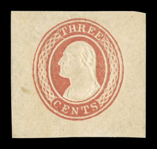 1360 og U1 image#U1, 3c Red on white, die 1, mint cut square, measuring 37x357mm, fresh color, choice very fine; an elusive cut square of this first die. (Image) $400.00
