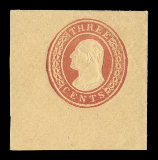 1366 og U4 image#U4, 3c Red on buff, die 2, mint cut square, a very scarce full corner example measuring a lavish 44x44mm, wonderfully fresh, with strong detailed embossing, small tear in the back flap only (not an integral part of the cut square), and of little importance as this is the only cut square that we have ever offered being first offered in our June 2000 Collector's Series Sale of the Jerry Summers Collection, extremely fine; ex-Summers. (Image) $350.00