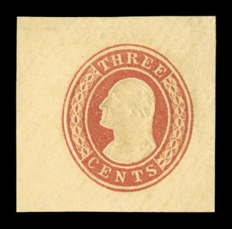 1365 og U3 image#U3, 3c Red on white, die 2, an uncommonly fresh and select mint cut square, being a full corner less the top back flap portion, measuring 35x40mm, deep luxuriant color on especially bright fresh paper, extremely fine; an elusive cut square that rarely comes up at auction, especially in this premium quality; ex-Summers. (Image) $1,300.00