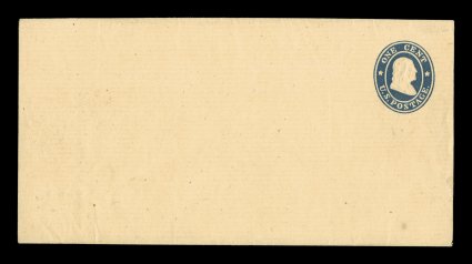 1374 ogc W20 var. image#W20 var., 1c Blue on buff, star die, die 12, knife W1A, variety without watermark, attractive entire wrapper with particularly deep imprint color and highly detailed embossing, tiny mounting thin on the reverse, very fine; the unwatermarked variety is considerably scarcer than the normal wrapper and valued at four times the normal in UPSS (UPSS #36). (Image) UPSS $400.00