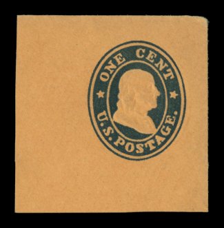 1375 og W22 image#W22, 1c Blue on orange wrapper, star die, very rare mint cut square of die 12 on orange paper, measuring 31x37mm, deep blue on horizontally laid orange paper, light and unobtrusive horizontal crease in the top margin not affecting the imprint, extremely fine appearance; an exceptionally elusive cut square of which there are believed to be only approximately ten examples known. (Image) $4,250.00