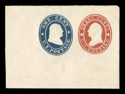 1362 ogc U1 image#U1, 3c Red on white, die 1, size 2, knife 2, wmk. 1, elusive mint example of this extremely rare entire, the smaller and more desirable size 2 which is valued 20% higher in UPSS, light fold and insignificant reduction at left, faint soiling at bottom, still very fine; ex-Barkhausen, Floyd (UPSS #1). (Image) $2,250.00