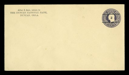 1521 ogc U476 image#U476, "2" on 3c Dark violet on amber, die 1, UPSS die 143, size 13, knife 80, wmk. 19, choice mint entire with printed corner card of the Duncan National Bank of Duncan, Oklahoma, plus Bank slogan printed on the reverse, strong colors, extremely fine; ex-Mason (UPSS #3018-19). (Image) $475.00