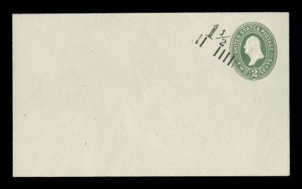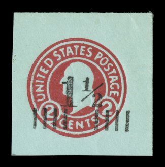 1528 ogc U486 image#U486, 1 1/2c on 2c Green on white, die 88(B) size 7, knife 31, wmk. 12, crisp mint entire, the surcharge has been applied at a 45 degree angle having gone through the canceling machine that applied the surcharge askew, exceptionally fresh and clean with sharp edges, extremely fine; a scarce entire, particularly in this choice condition (UPSS #3078-12). (Image) $1,300.00