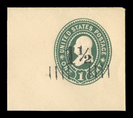 1535 og U494 image#U494, 1 1/2c on 1c Green on manila, die 1, mint cut square, nearly a full corner with just the top flap removed, measuring a large 48x50mm, fresh and extremely fine. (Image) $400.00