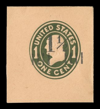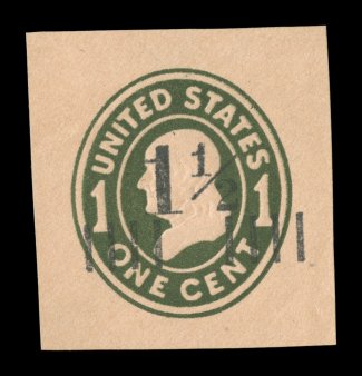 1531 og U488 image#U488, 1 1/2c on 1c Green on white, impressive mint cut square, measuring an extra large wide 58x54mm, especially clean and fresh, extremely fine; it is reported that only 39 copies were issued. (Image) $675.00