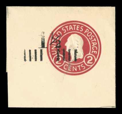 1536 og U502a image#U502a, 1 1/2c on 2c Carmine on white, die 5, mint cut square, large full corner example measuring 53x50mm, attractive and extremely fine. (Image) $400.00