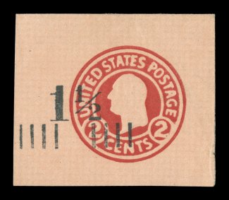 1538 ogc U503 image#U503, 1 1/2c on 2c Carmine on oriental buff, die 5, UPSS die 138, size 10, knife 58, wmk. 22, attractive mint entire, bright fresh colors, sharp clear surcharge, extremely fine (UPSS #3179). (Image) $525.00