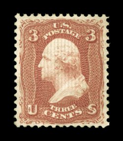 143 ogu 88 image#88, 3c Rose, "E" grill, a magnificent mint example of this surprisingly difficult value, being wonderfully well centered amid large margins, sumptuously rich color and an especially clean impression, plus an exceptionally full and strong grill, full original gum which has been very lightly hinged, extremely fine; a truly rare stamp in this outstanding quality; 2002 and 2007 PF certificates (the latter graded XF 90; SMQ $2,750.00). (Image) $1,200.00