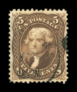 154 Ou 95 image#95, 5c Brown, "F" grill, far better centering and larger margins than typically associated with this stamp, sumptuously rich color and a well incised impression, unusually light cancel as well, extremely fine; 2002 PF certificate and a 2005 PSE certificate (VF-XF 85; SMQ $1,300.00); the extreme difficultly in obtaining premium quality used examples of this stamp is borne out by the fact that this is the highest grade the PSE has assigned to #95, being one of only two so graded. (Image) $875.00
