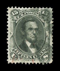 152 Ou 91 image#91, 15c Black, "E" grill, an unusually select used example of this scarce grilled stamp, featuring margins that are uncharacteristically wide and being exceptionally well centered within them, rich color and a clean impression, light black cork cancel with a trace of a red cancel at bottom, extremely fine; a terribly challenging stamp to find in this premium condition; 1995 and 2007 PF certificates (the latter graded VF-XF 85; SMQ $1,050.00). (Image) $675.00