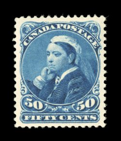 1666 nh Unitrade #47i imageUnitrade #47i, 1893 50c Deep blue, major re-entry, position 6, showing a doubling at top in the ornaments and particularly the outer frame line, unusually well centered within large to extra-large margins, intense color and razor-sharp impression on bright paper showing the re-entry exceptionally well, full o.g., never hinged, choice very fine and a seldom offered variety; 1998 RPS certificate. (Image) Unitrade C$2,250.00
